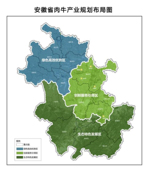 《规划》立足安徽资源禀赋、环境承载能力、产业基础和区位条件等因素,提出以良种繁育为引领,以标准化规模养殖为基础,以产业融合为重点,以科技装备为支撑,以种养循环为纽带,以“双招双引”为抓手,着力扩规模、提质量、延链条、创品牌、增效益,培育千亿级绿色食品肉牛产业,把安徽打造成中原高品质肉牛种源供应基地和长三角优质肉牛生产加工供应基地,为推动安徽农业强省、美好安徽建设贡献力量。《规划》运用畜禽粪污土地承载力测算方法和草畜平衡测算模型,科学开展资源环境承载能力分析,深入开展市场潜力及全国肉牛产业发展趋势分析,多维度研究提出2023—2030年安徽肉牛产业发展目标。《规划》坚持因地制宜、分类施策,统筹考虑区域功能与开发程度,将全省划分为皖北、皖中、皖南三个肉牛产业优势区,提出差异化发展策略,协调推进全省肉牛产业高质量发展。《规划》共谋划八大类23个重点项目,总投资419.05亿元,并通过“自上而下”和“自下而上”相结合的方式,提出首批推进的项目清单,进一步提高了规划的针对性和可操作性。