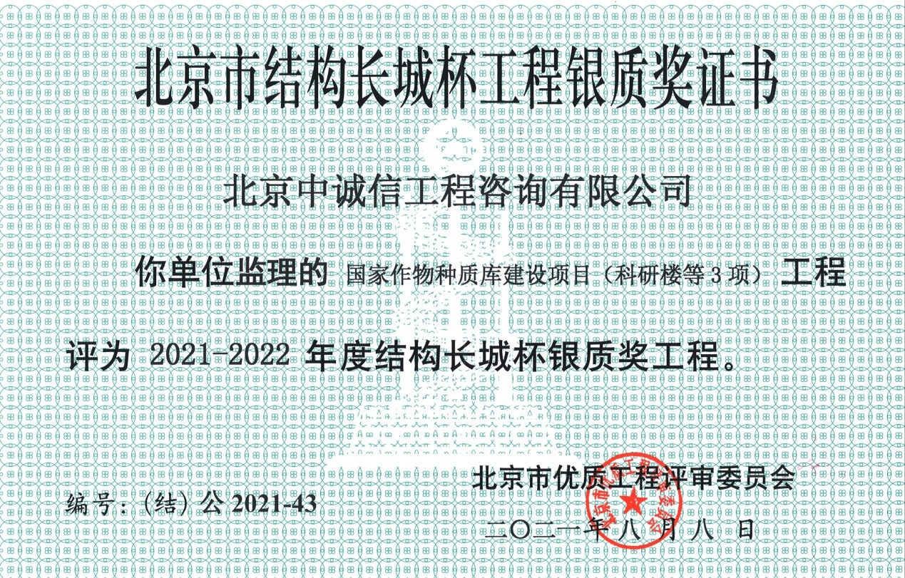 我院北京中诚信工程咨询公司监理的国家作物种质库建设项目(科研楼等3项)工程荣获“北京市2021-2022年度结构长城杯银质奖工程”荣誉称号。