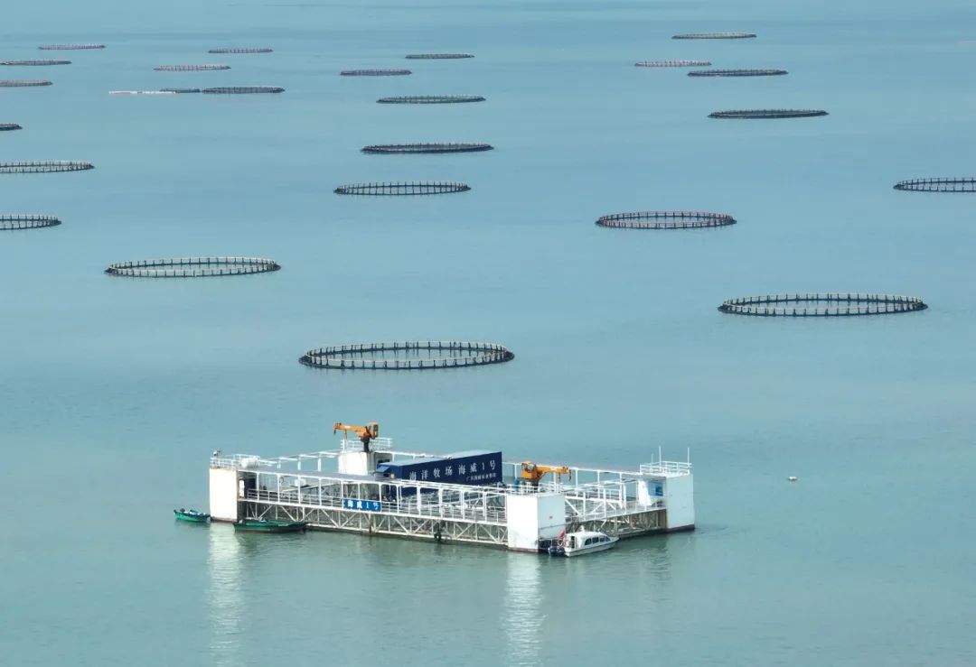半潜桁架式渔业智能养殖平台海威1号及其附属网箱集群。