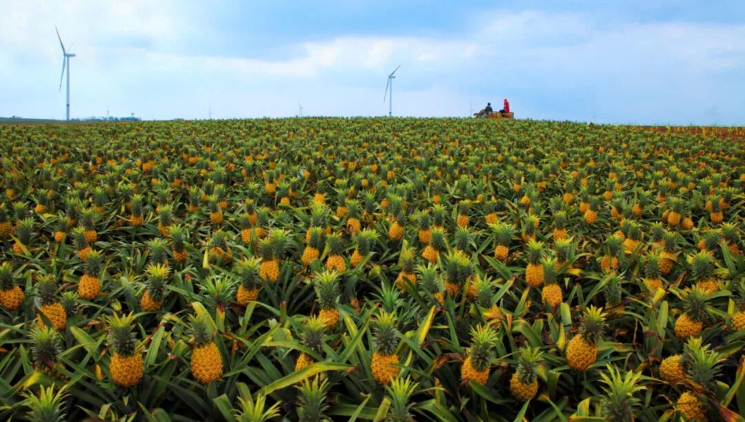 在广东南端的雷州半岛,从空中俯瞰,一望无际的菠萝在红土地上显得格外醒目,像精心编织的锦缎,又像是大地打翻了调色板。这里是湛江的徐闻县,是我国最大的菠萝产区,种植面积超过35万亩,年产量高达70多万吨,占据全国菠萝产量的1/3。