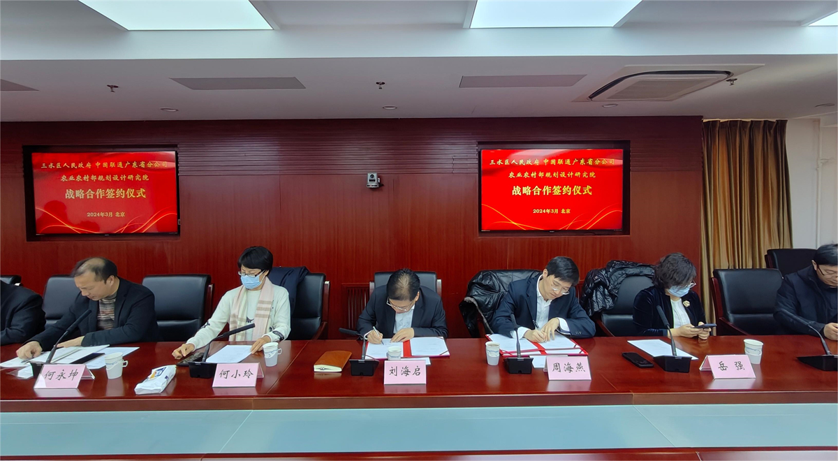 3月1日,我院与广东省佛山市三水区人民政府、中国联合网络通信有限公司广东省分公司三方战略合作协议签署仪式顺利举行。张辉院长会见三水区何小玲副书记、中国联通集团周海燕总监一行,刘海启组长、三水区农业农村局、广东省和三水区联通公司有关同志共同见证了签约仪式举行。