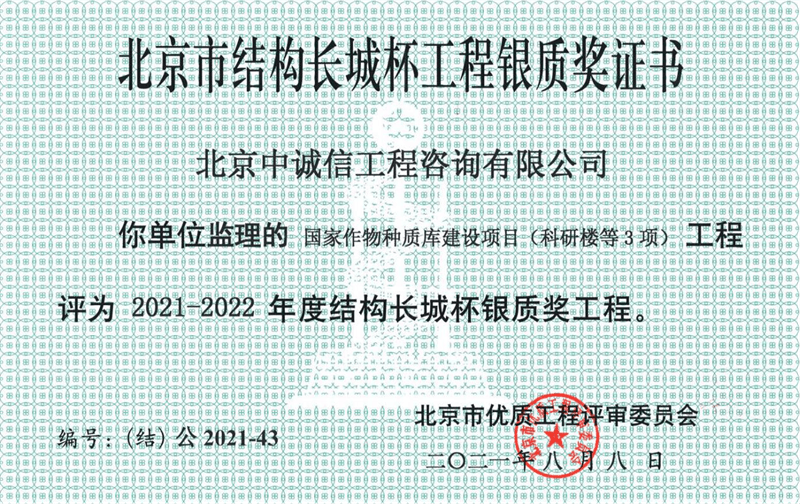本工程于2021年8月8日被北京市优质工程评审委员会评定为“北京市建筑(结构)长城杯”工程!投入使用一年多来,运行稳定,效果良好,得到使用单位的高度评价。